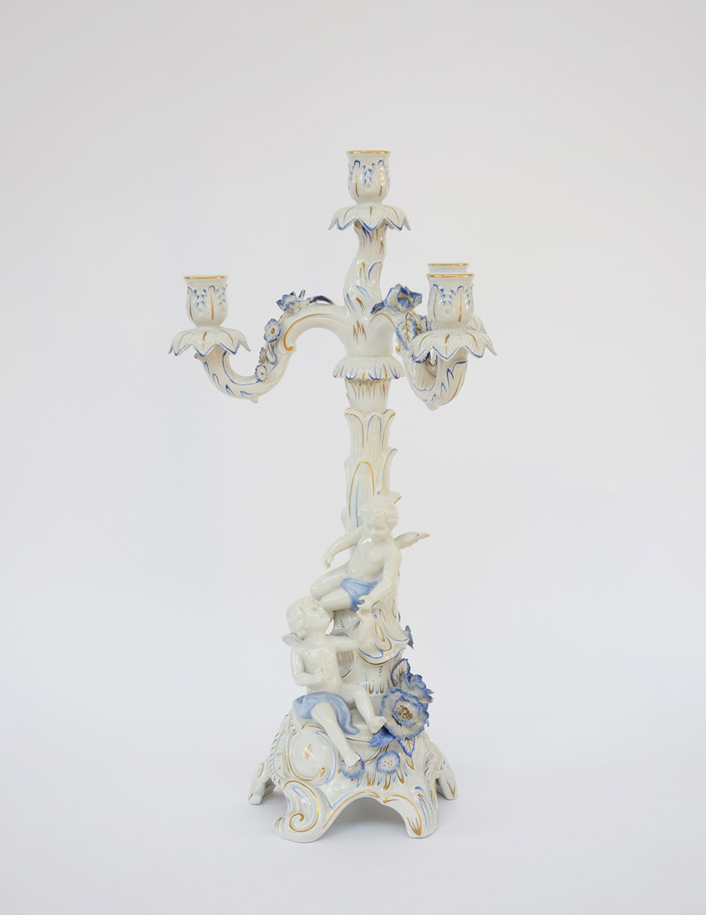 Candeliere a quattro fiamme in ceramica decorato in policromia in rilievo a putti e fiori (h. cm 55) (difetti)