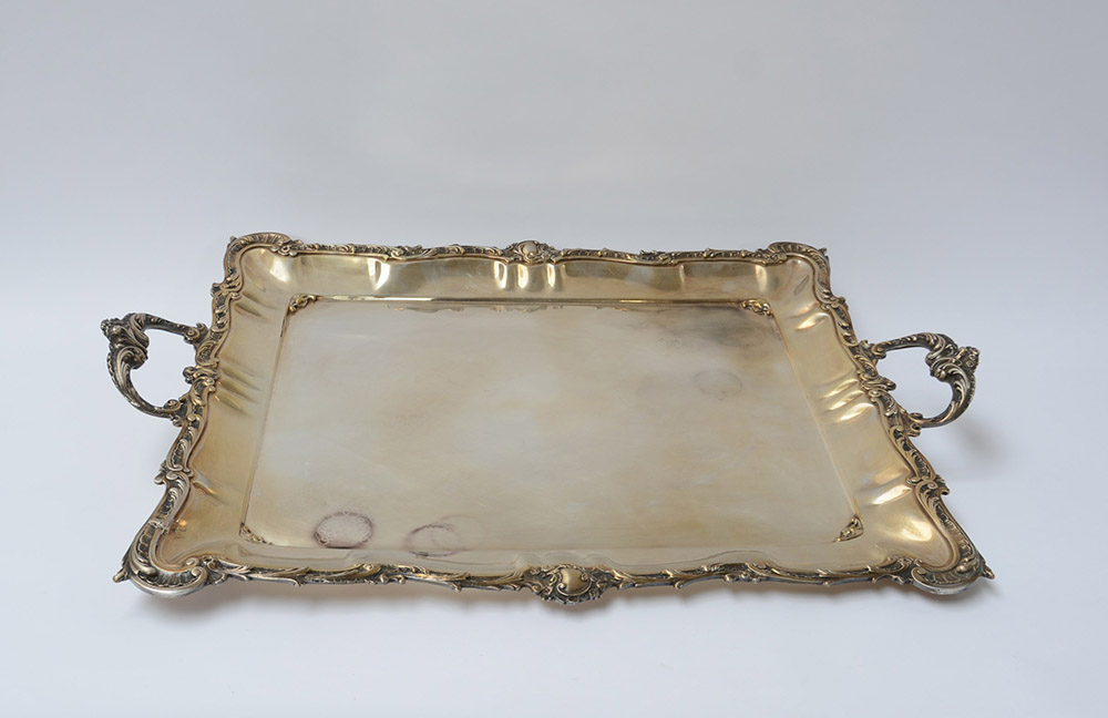 Grande vassoio da portata biansato in metallo argentato con profilo mistilineo (cm 77x56)(difetti)