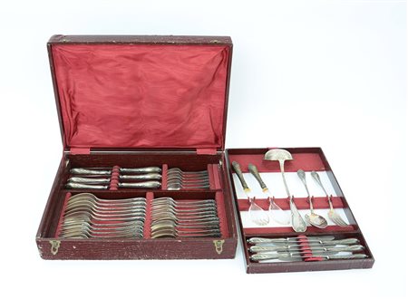 Servizio di posate in alpacca argentata marcate Martin composto da sei cucchiai, sei forchette e sei coltelli grandi, sei cucchiai per dolce, sei forchette e sei coltelli per frutta, sei cucchiaino, un mestolo e quattro posate da portata, in custodia originale (difetti)