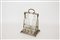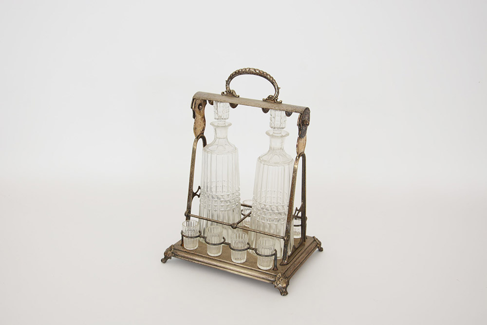 Tantalus in metallo argentato completo di bottiglie con tappi e bicchierini in vetro (difetti)