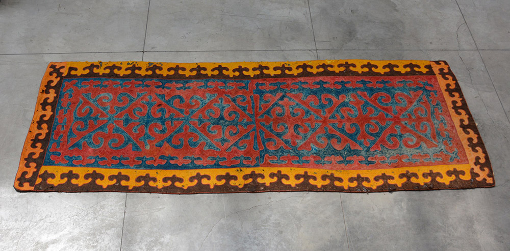 Tappeto in feltro di lana a più colori e strati sovrapposti. Uzbekistan, XX secolo (cm 388x146)(difetti)