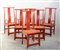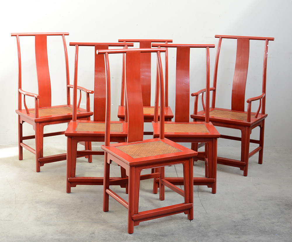 Sei sedie in legno laccato in rosso, schienale sagomato e seduta impagliata, due con braccioli. Cina, secolo XX