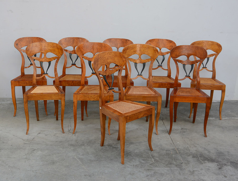 Gruppo di dieci sedie di gusto Biedermeier, schienali a giorno e seduta asportabile incannucciata (difetti e restauri)
