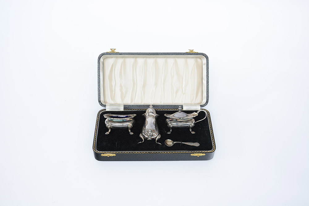 Piccolo set da tavolo in argento composto da due salierine, un porta-sale e un cucchiaino contenuti in astuccio