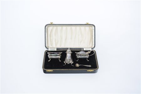 Piccolo set da tavolo in argento composto da due salierine, un porta-sale e...