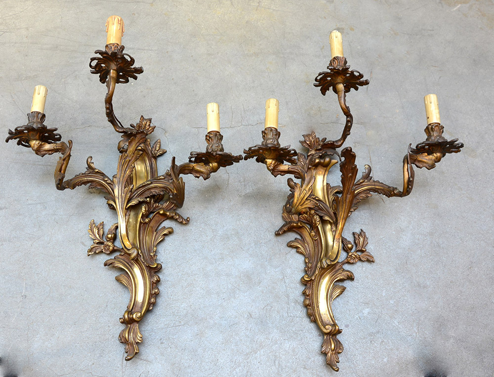 Coppia di appliques a tre fiamme in bronzo (h. cm 60)