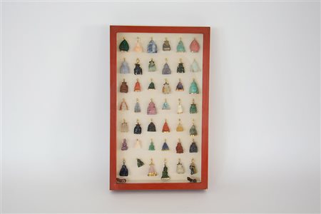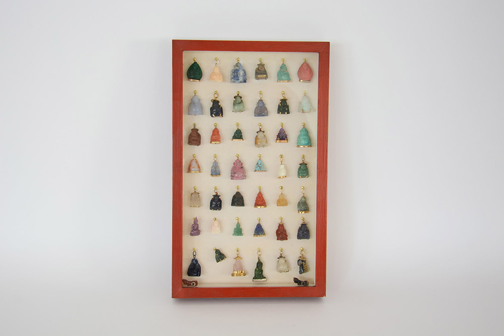 Collezione di quaranta tra Buddha e cagnolini in vetro e pietra dura con montatura in metallo dorato, in teca Cina, sec. XX (varie misure)