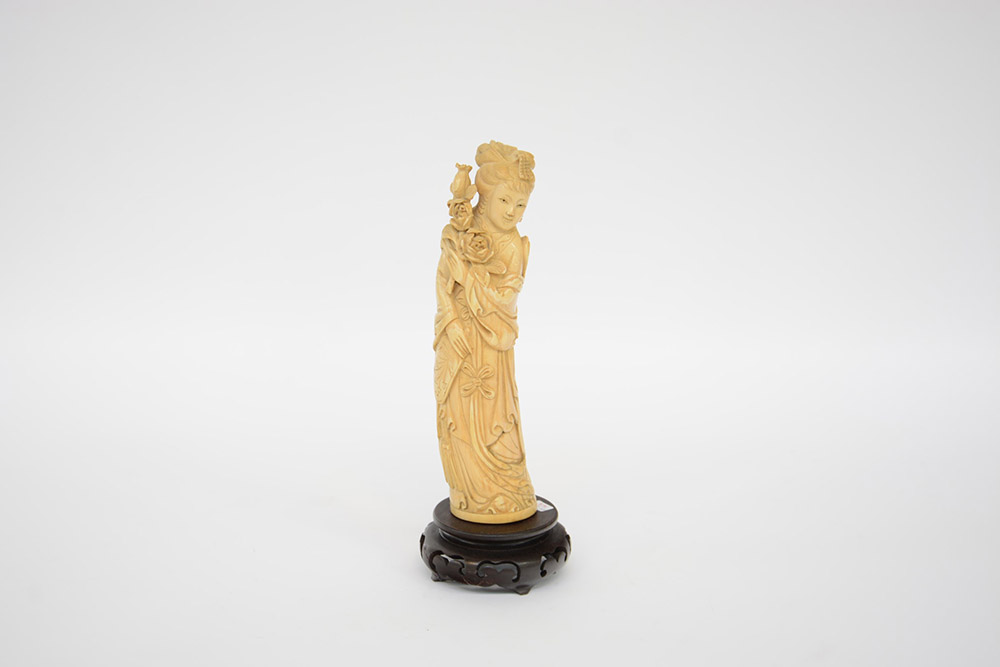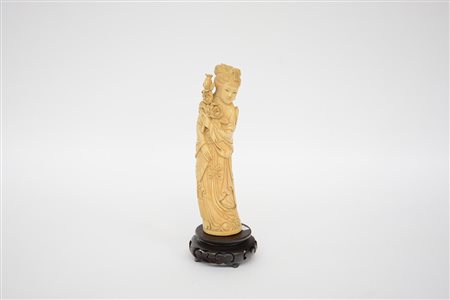 Scultura in avorio raffigurante dama con fiori e peonie, su base in legno (difetti) CIna, sec. XX (h. 23 cm.)