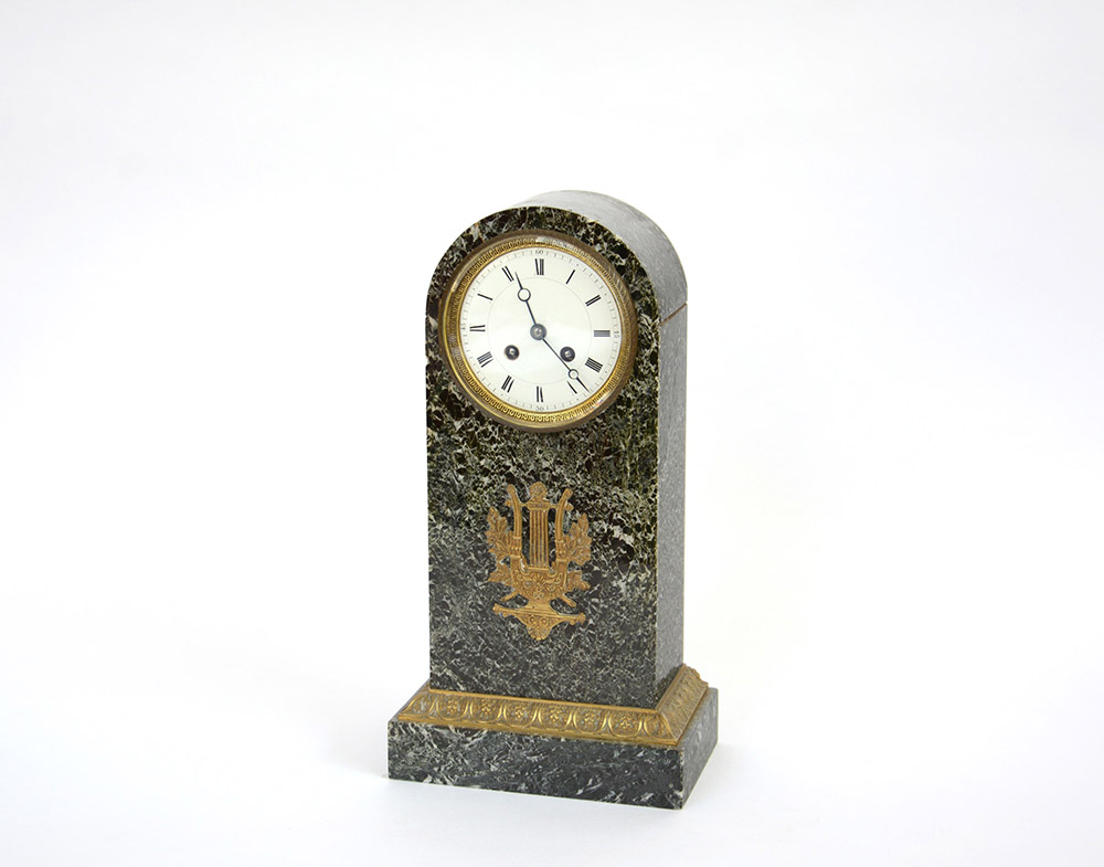 ANONIMO, FRANCIA Pendola di forma architettonica in marmo verde Alpi Epoca, seocnda metà sec. XIX Movimento a carica settimanale, suoneria ore mezze, scappamento ad ancora, sospensione brocot Quadrante in smalto bianco, cifre romane (h. cm 40)