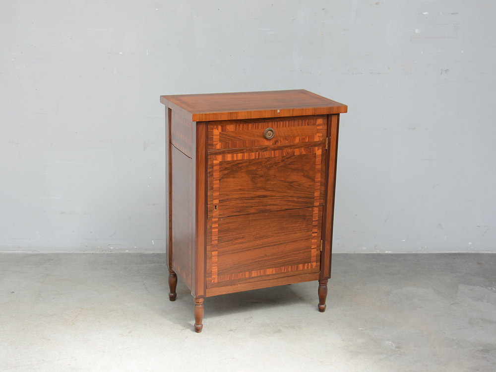 Comodino ad un'anta impiallacciato in noce con filettature a contrasto (cm...