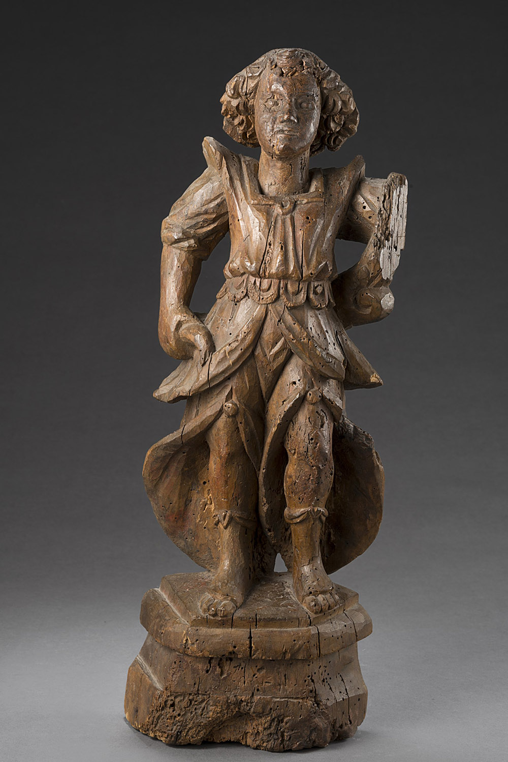 Scuola del sec. XVII "Figura stante" scultura in legno intagliato (h cm 51) (difetti) School of the 17th century. Carved wooden sculpture (defects)