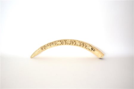 Zanna in avorio scolpito con teoria di elefanti e alberi in altorilievo, firmata dall'artista a destra, accompagnata dal certificato CITES (l. cm 68) (lievi difetti)