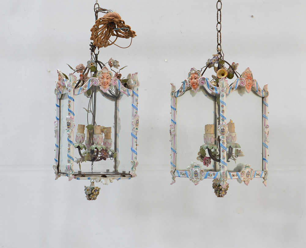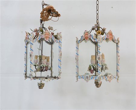 Coppia di lampadari a forma di lanterne in porcellana policroma di gusto neo-barocco. La decorazione è arricchita superiormente da mascheroni ed inferiormente da stemmi araldici in ricche cornici barocche. All'interno delle lanterne sono presenti fiori plastici policromi che incorniciano i quattro punti luce. Fine sec. XIX (h. massima cm. 50x26) (difetti e restauri)