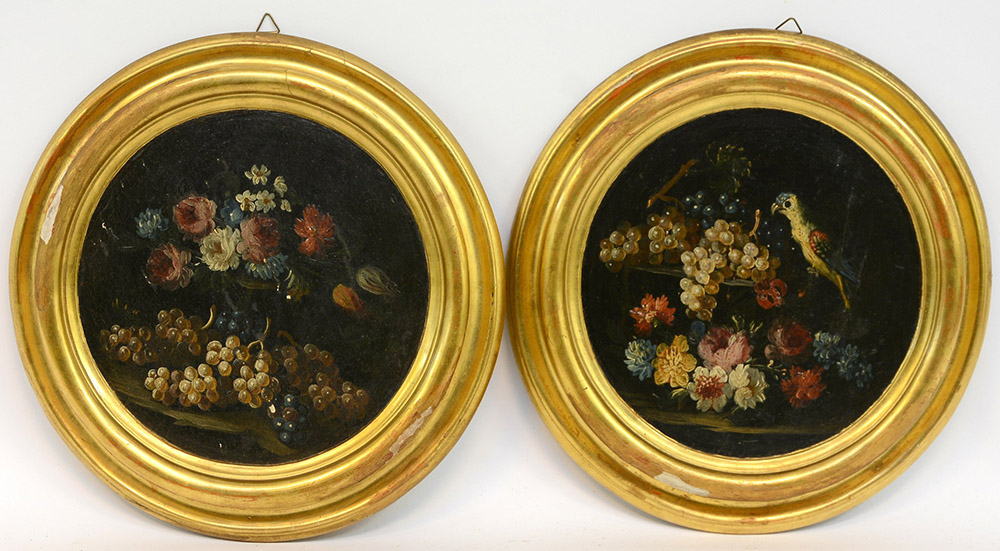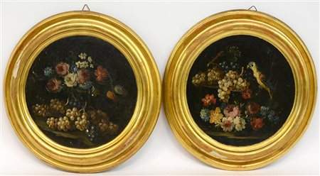 Arte del secolo XIX coppia di medaglioni tondi in legno dipinti in policromia con fiori e uccelli, cornice dorata (d cm 25)(difetti)