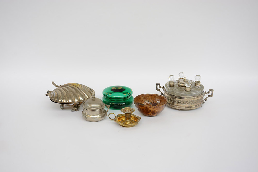 Lotto composto da un servizio da tavola in argento e vetro, un contenitore a forma di conchiglia, una coppetta, una bugia e due scatolette con coperchio in vetro, metallo e lacca (difetti e mancanze)