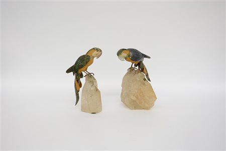 Coppia di sculture in pietre dure raffiguranti are su basi a finta roccia in quarzo (h cm 28) (difetti e mancanze)