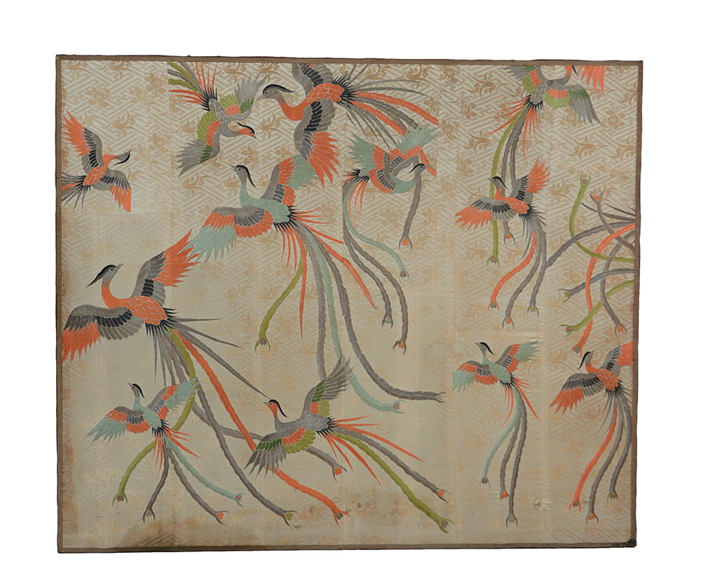 Pannello orientale in seta operata color beige decorato a filo di metallo argentato e dorato con uccelli del paradiso in volo. Giappone, sec. XX (cm 208x175) (difetti e rotture)