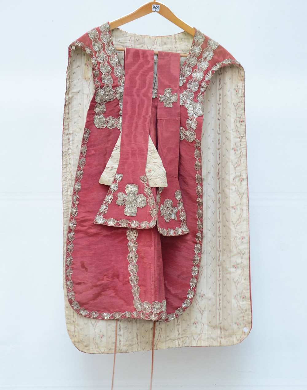 Pianeta confezionata con antico tessuto Moaire rosso cardinale con evidenti marezzature, passamanerie in metallo argentato, interno di tessuto Chinè a righe e meandri (difetti)