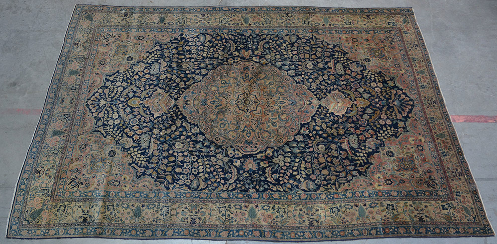 Tappeto Keshan, fine sec. XIX. Disegno a medaglioni rosa su fondo blu. Decorazione con rami fioriti in policromia (cm 365x251) (difetti)