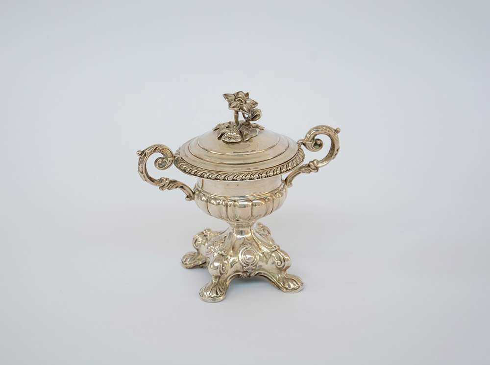 Zuccheriera in argento a due manici con corpo a cratere baccellato e base a quattro piedini a volute fogliate; coperchio con pomolo floreale. Italia, fine sec. XIX (Italia Turrita) (cm 17xh. cm 16)(gr lordi 330 ca.) (difetti)