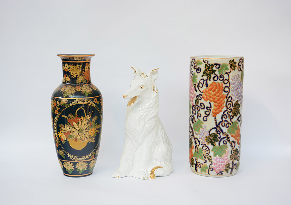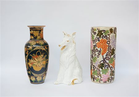 Lotto composto da un portaombrelli, una scultura raffigurante cane e un vaso in ceramica policroma (difetti)