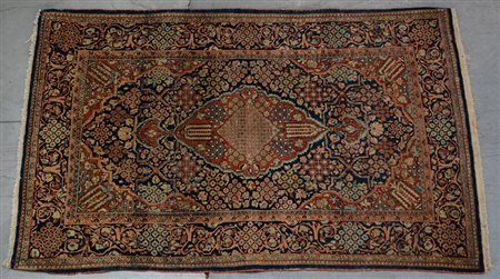 Tappeto Kashan Da Bir, Persia sec. XX. Disegno a medaglione con fondo mattone su campo blu decorato con gruppi di fiori policromi (cm 211x133) (difetti)