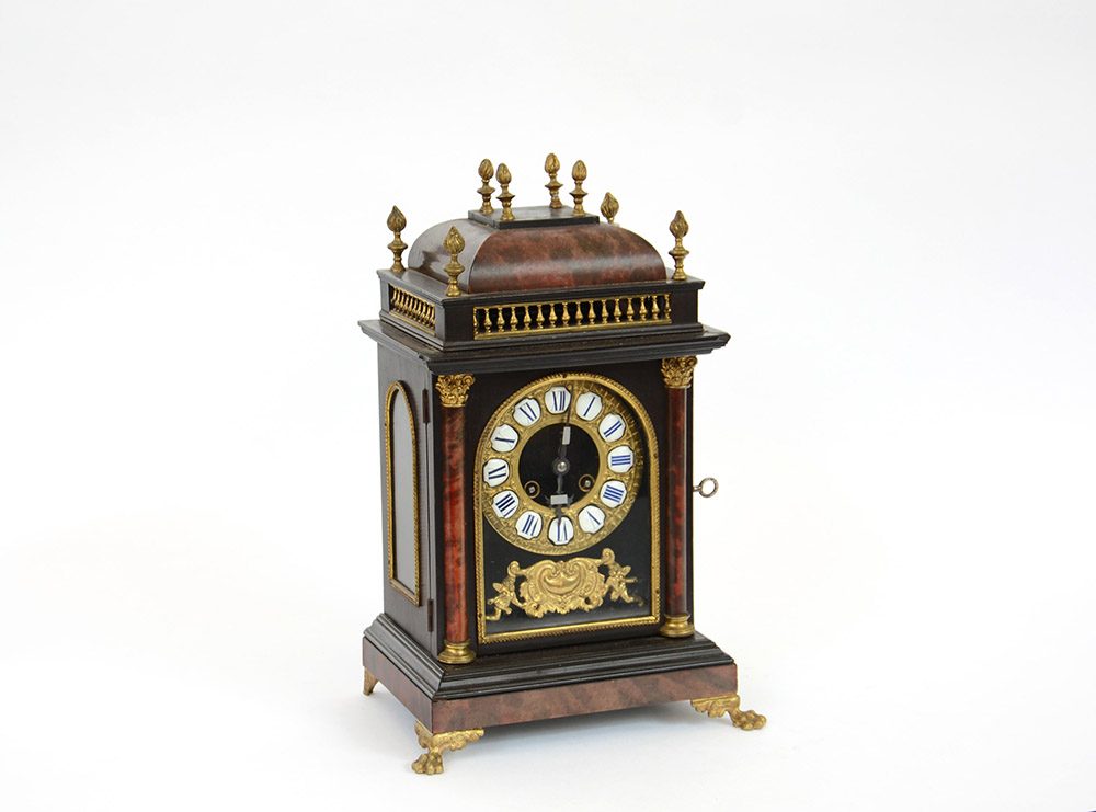 ANONIMO, FRANCIA Pendola di forma architettonica in legno con colonne e cappello lastronati Epoca sec. XX Movimento a carica settimanale, suoneria ore mezze, scappamento a brocot, sospensione a filo Quadrante con cartuches in smalto con numeri romani(cm 35x23)