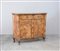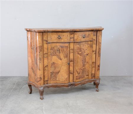 Credenza di forma mossa lastronata in radica di noce a due cassetti sottopiano e antine sul fronte e due laterali. Piedi sagomati e intagliati (cm 133x105x32) (difetti)