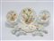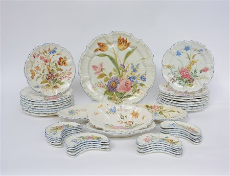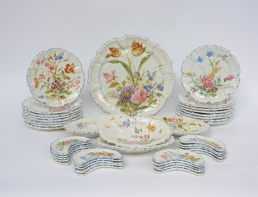 Lotto di piatti costolati e mistilinei in maiolica con decoro policromo a tutta superficie a mazzi di fiori, bordi con profilo in blu in cui si alternano linea e punto; composto da: 16 piatti tondi (d cm 23), 1 piatto tondo (d cm 34), 20 piccoli piatti a mezzaluna, 4 vassoi ovali. (Rotture, restauri e sbeccature). Marca di fabbrica G.B.V. apposte con caratteri e colori diversi. Nove di Bassano, manifattura Viero. XIX/XX secolo