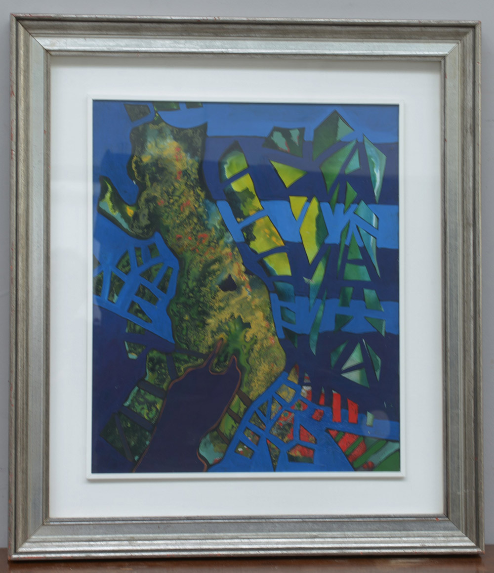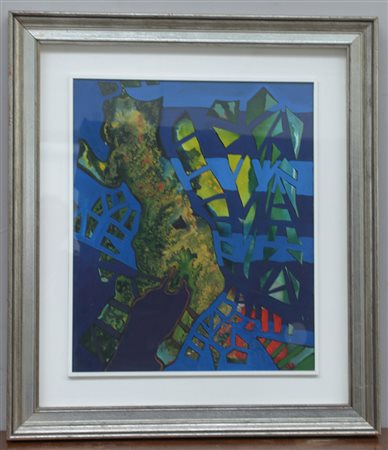 Firma indecifrata, "Composizione", acrilico su tela (cm 60x50) firmato al verso, in cornice