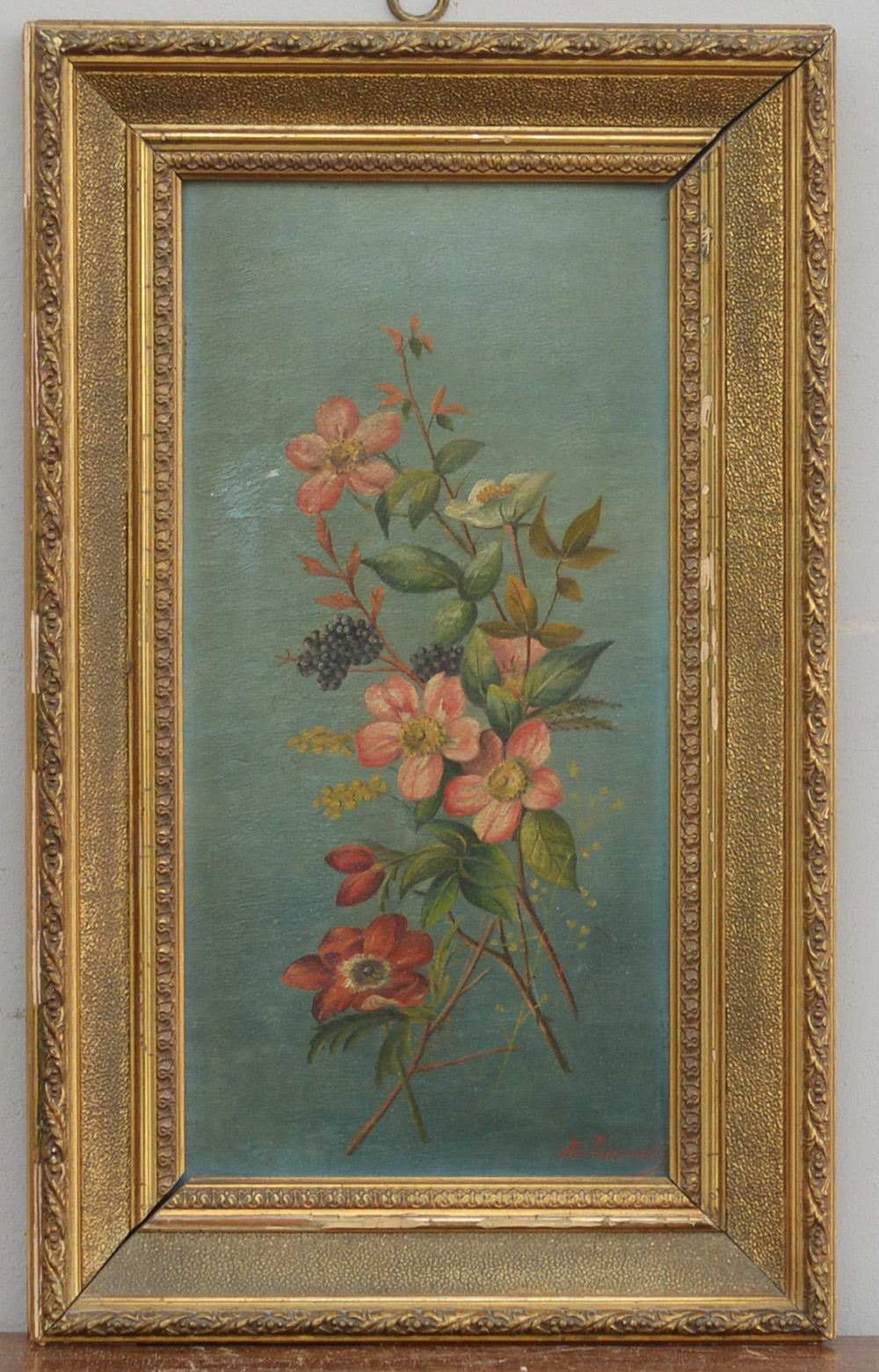 Firma indecifrata, "Rami fioriti", olio magro su cartone (cm 39x20) firmato in basso a destra, in cornice (difetti)