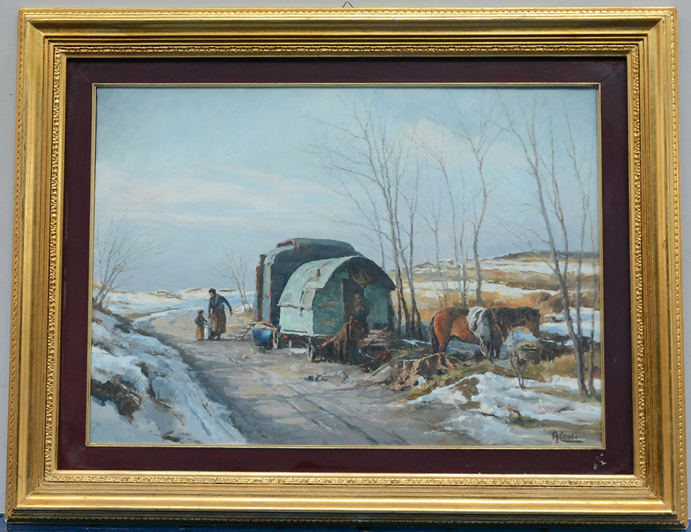 A. Conti "Paesaggio invernale con carro e contadini" olio su tela (cm 50x70) firmato in basso a destra. In cornice