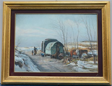 A. Conti "Paesaggio invernale con carro e contadini" olio su tela (cm 50x70)...