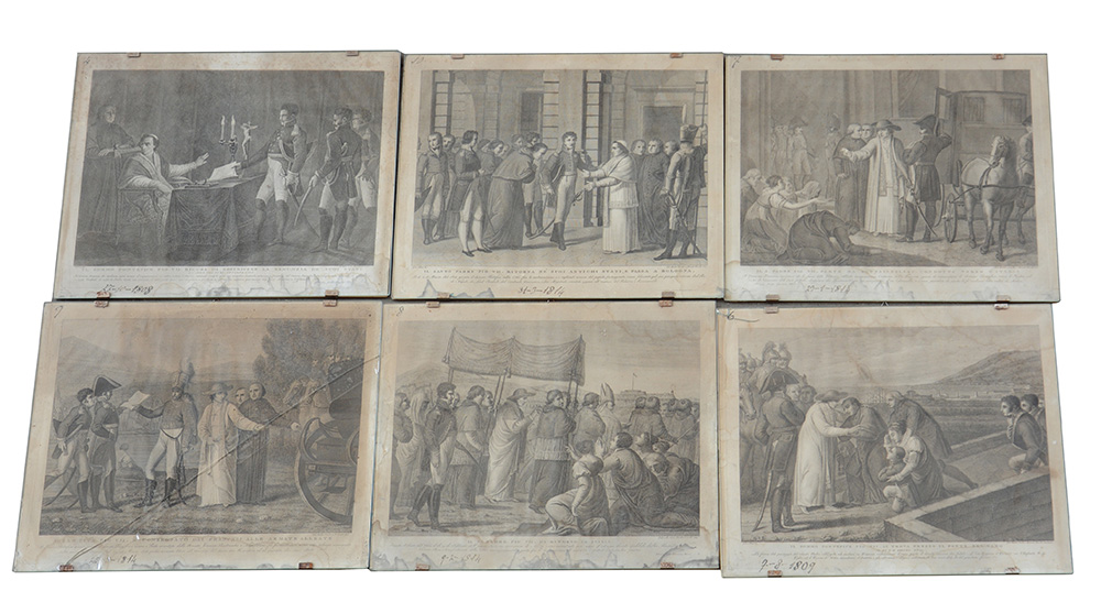 Giovanni B. Cecchi e Benedetto Eredi - Serie di quindici incisioni del sec. XIX narranti gli episodi della "Vita di papa Pio VII" (cm 35x42), in cornici a giorno (gravi difetti)