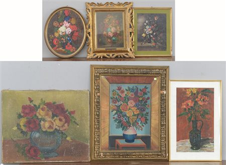 Lotto composto da due dipinti e quattro riproduzioni raffiguranti fiori, uno senza cornice; misure differenti (difetti)