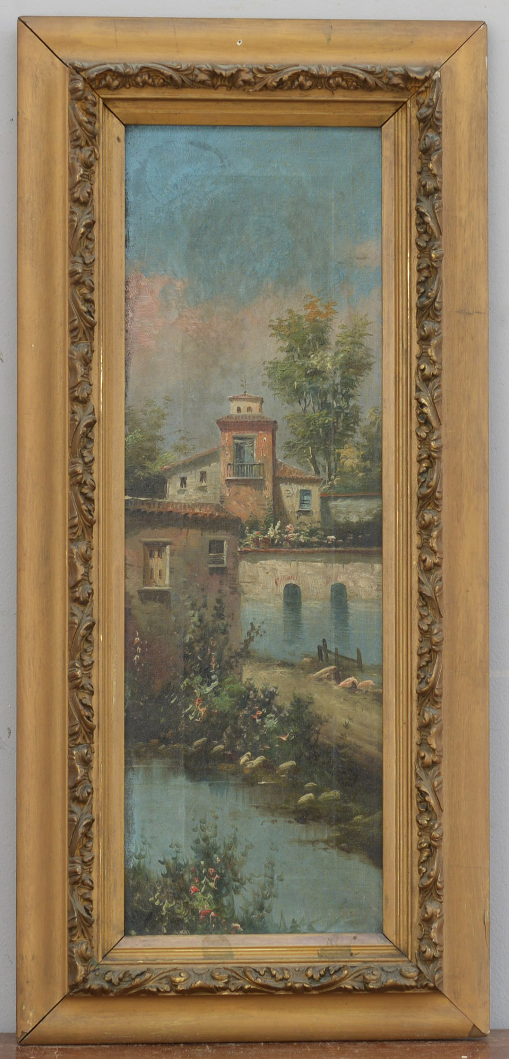 Firma indecifrata, "Scorcio di paesaggio lacustre con edifici", olio su tela (cm 59,5x20) siglato in basso a sinistra, in cornice (lievi difetti)