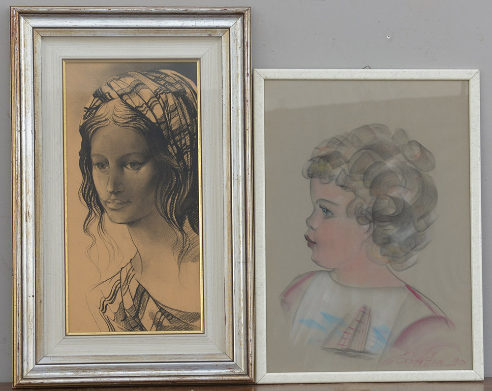 Lotto di due disegni raffiguranti un bambino e un volto femminile, di autori e misure differenti, in cornici (difetti)