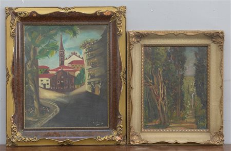 Lotto di due dipinti ad olio, su tela e cartone, raffiguranti scorci di paesaggi, di autori differenti (cm 50x40 e 40x30), in cornici (difetti)