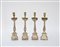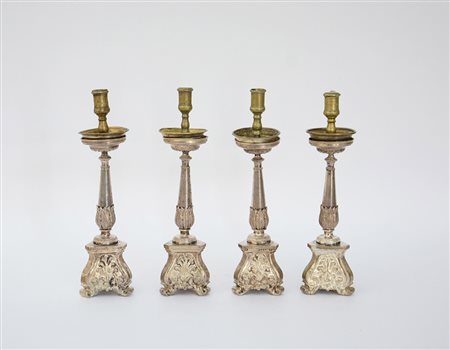 Lotto di quattro portaceri in metallo sbalzato, decorato da foglie e volute (h cm 26,5) (difetti)