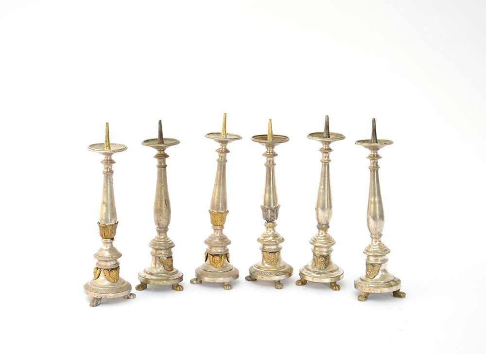 Lotto composto da sei portaceri in metallo con fusto tornito decorati da...
