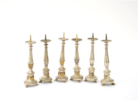 Lotto composto da sei portaceri in metallo con fusto tornito decorati da angeli, foglie e piedi a zampa ferina (h cm 27) (difetti e piccole varianti nella decorazione)