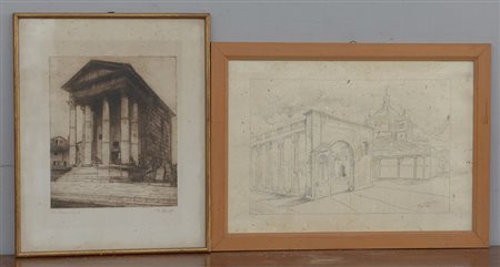 Lotto composto da un acquerello raffigurante il Tempio d'Augusto a Pola e un disegno raffigurante le colonne di San Lorenzo a Milano, di autori e misure differenti, in cornici (difetti)