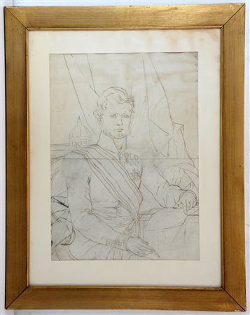 Disegno su carta (cm 43x31) a inchiostro e mina di piombo, preparatorio per un ritratto di generale. Italia, I metà del XIX secolo. In cornice (lievi difetti)