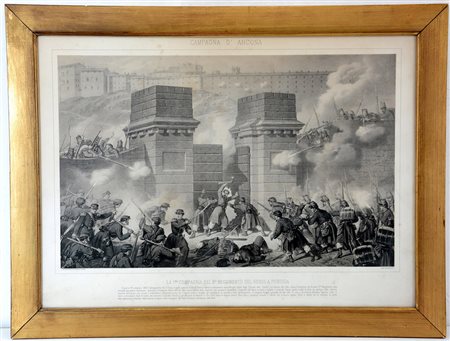 Grande litografia (cm 44x62) sull'assedio di Ancona da parte dei Piemontesi: scontro tra la fanteria piemontese e quella pontificia. Torino, 1864. In cornice