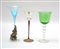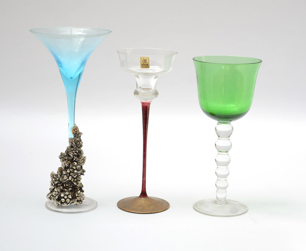 Manifatture diverse Sec. XX, lotto composto da tre bicchieri in vetro verde, trasparente, azzurro e rosso, uno con applicazione in metallo argentato. Misure diverse
