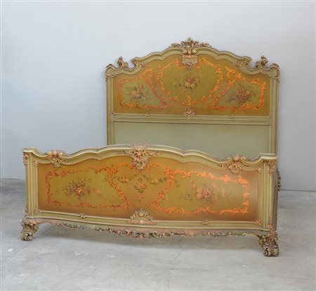 Letto matrimoniale in stile veneziano, in legno laccato a fondo verde decorato in policromia e oro con fiori e volute. Completo di sponde (difetti)