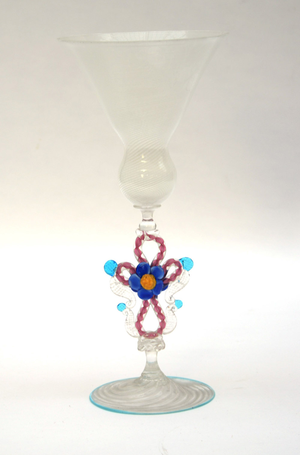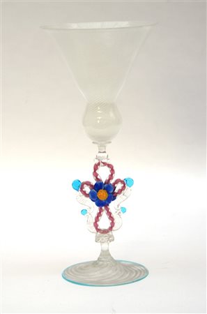 Manifattura di Murano del secolo XX grande bicchiere in vetro soffiato decorato con striature bianche e applicazioni a fiori in pasta di vetro (h cm 29,5)