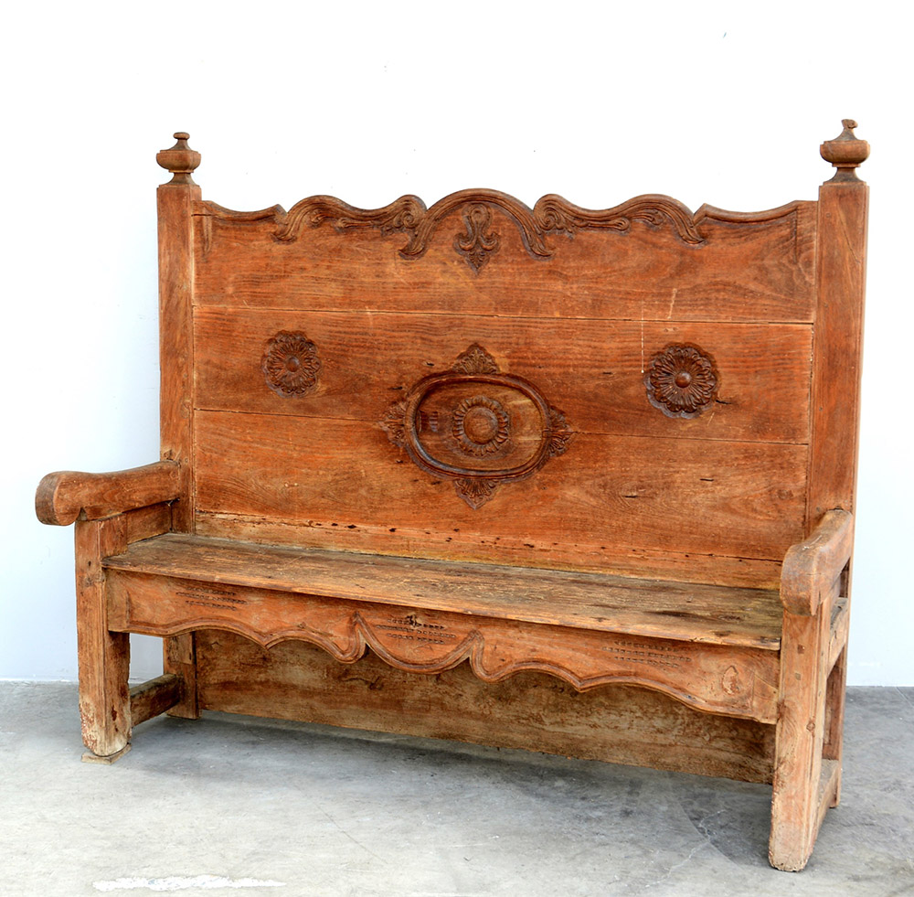 Panca con schienale alto di forma sagomata e intagliata, decorata da rosoni e volute. Montanti e fascia sagomati sec. XVIII (difetti)