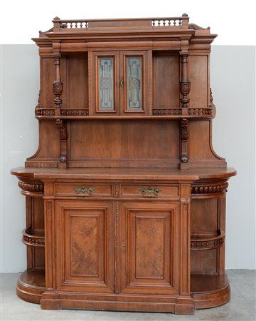 Credenza a due corpi lastronata in noce. Parte superiore a due ante a vetri e montanti a colonna tornita, parte inferiore ad un cassetto sottopiano, due ante sul fronte e vani laterali a giorno con ringhierine traforate. Inizio sec. XX (cm 180x225x70) (difetti)