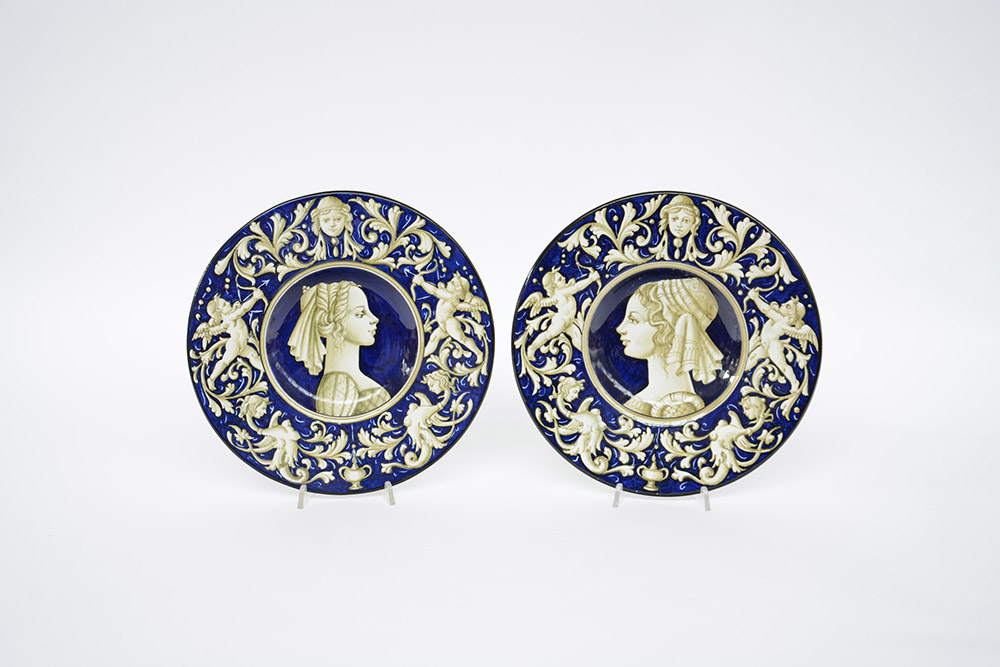 Manifattura italiana, Pesaro. Coppia di piatti in ceramica a fondo blu decorato con profili femminili, putti e volute